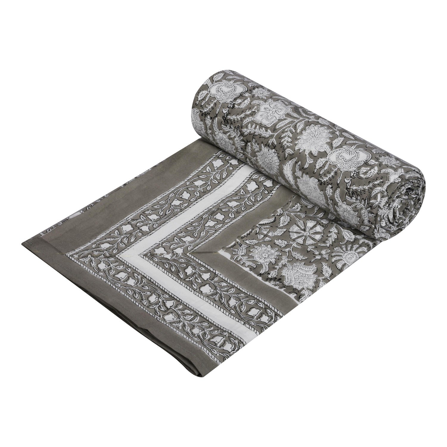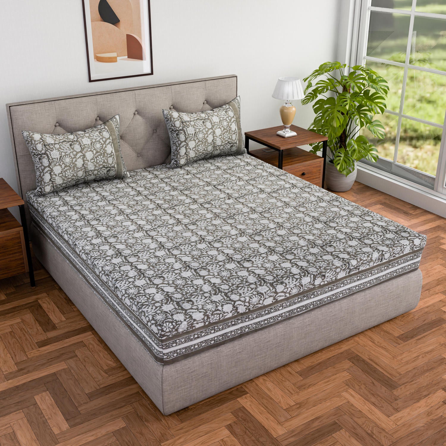 Expertly crafted from pure cotton using traditional hand block printing techniques, this king size bedsheet (100 x 108 inches) features a striking grey tree design. Includes 2 matching pillow covers. Experience comfort and elegance in your bedroom with this high-quality bedding set.